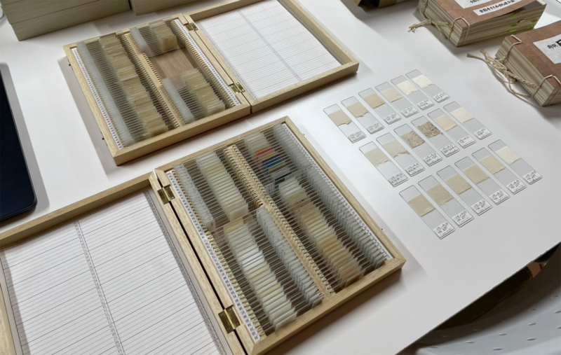 [Photo 12] Microscope slides of paper specimens currently being prepared in the laboratory.