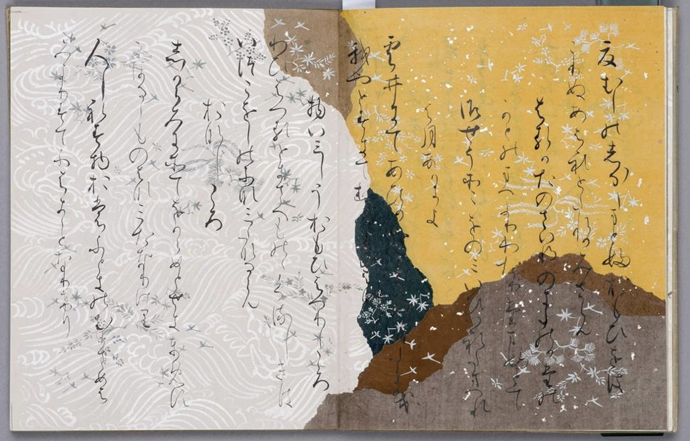 These manuscripts include paper with paper patterns such as Uchigumo, Tobikumo, and Ramon, as well as dyed, unei-zuri, suminagashi, gold and silver sandago (sunago) paper.), cut leaf (kirihaku), and gold-painted writing paper were used.