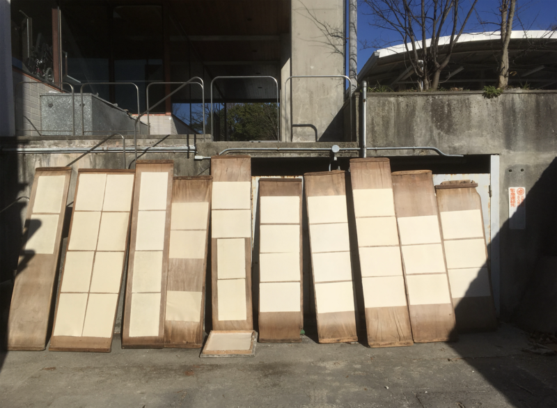 [Photo 5] Itaboshi of Kozo paper (method of drying Kozo paper by pasting it onto wooden boards and exposing it to sunlight).
