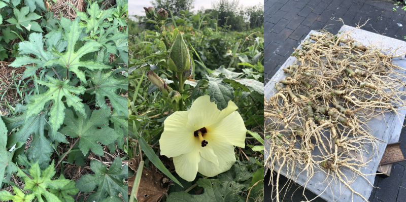 This is tororo aoi or tororo mallow. They contain a sticky substance called neri which is very similar to okra’s stickiness. This is my field and I grow these tororo aoi myself.
