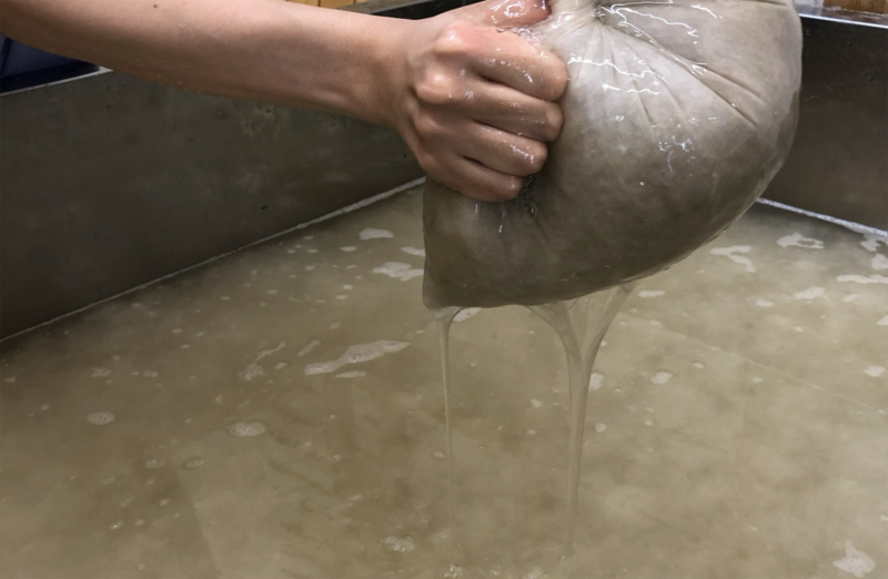 This shows the process of pouring the “neri” which is a sticky substance into the water.
