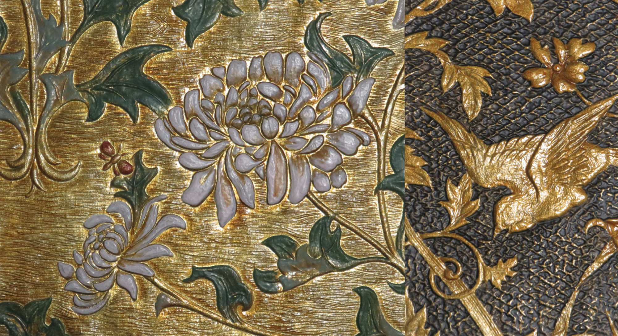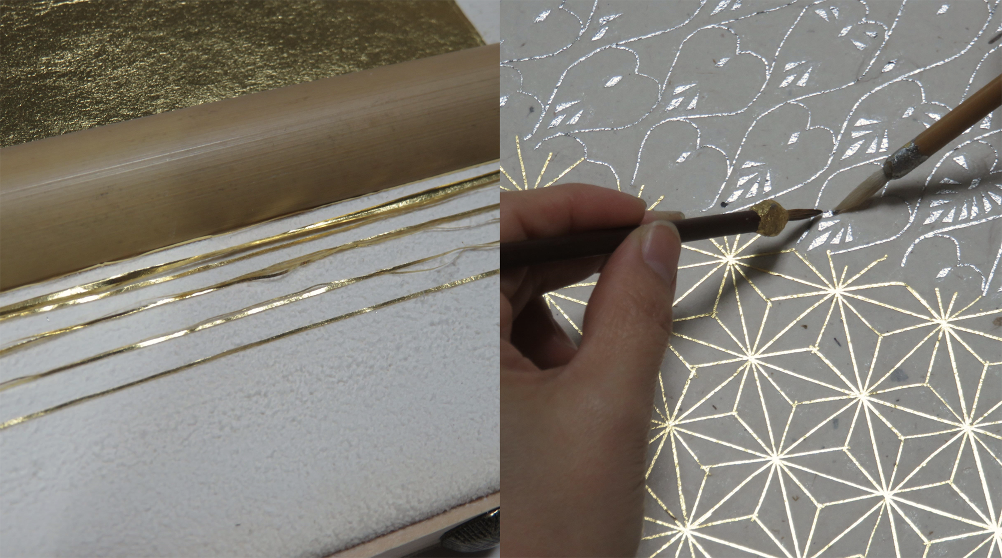 Among them, “kirikane” is a traditional technique that only survives in Japan. Kirkane is the technique of pasting each piece of gold leaf that has been cut with a small bamboo knife.