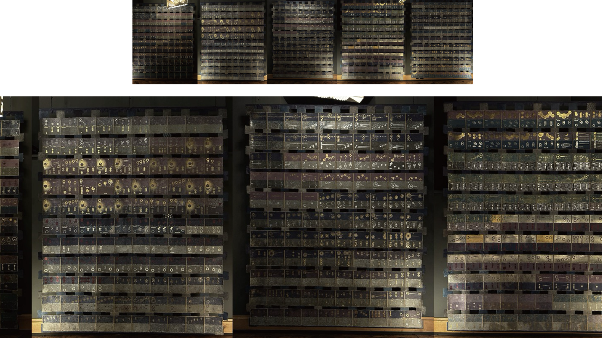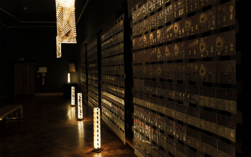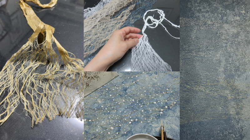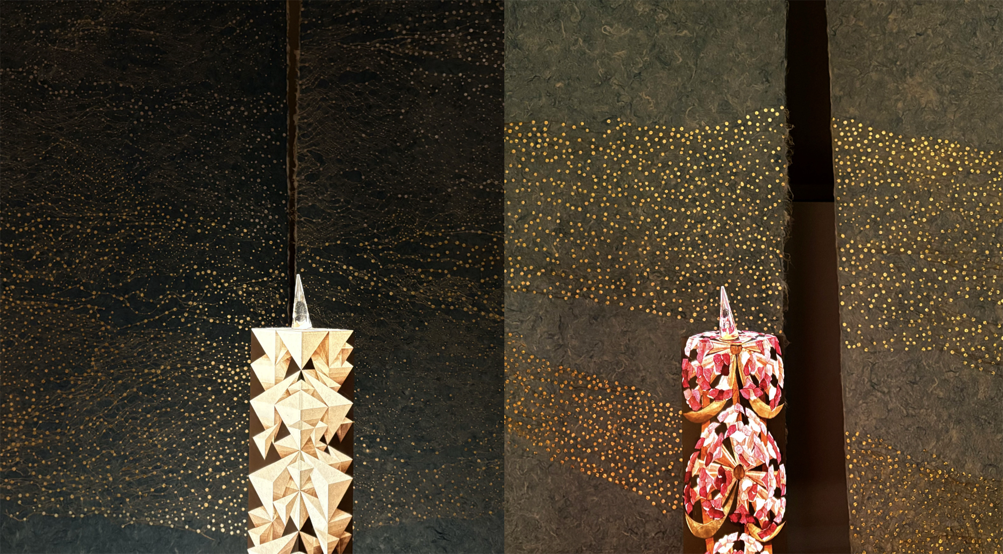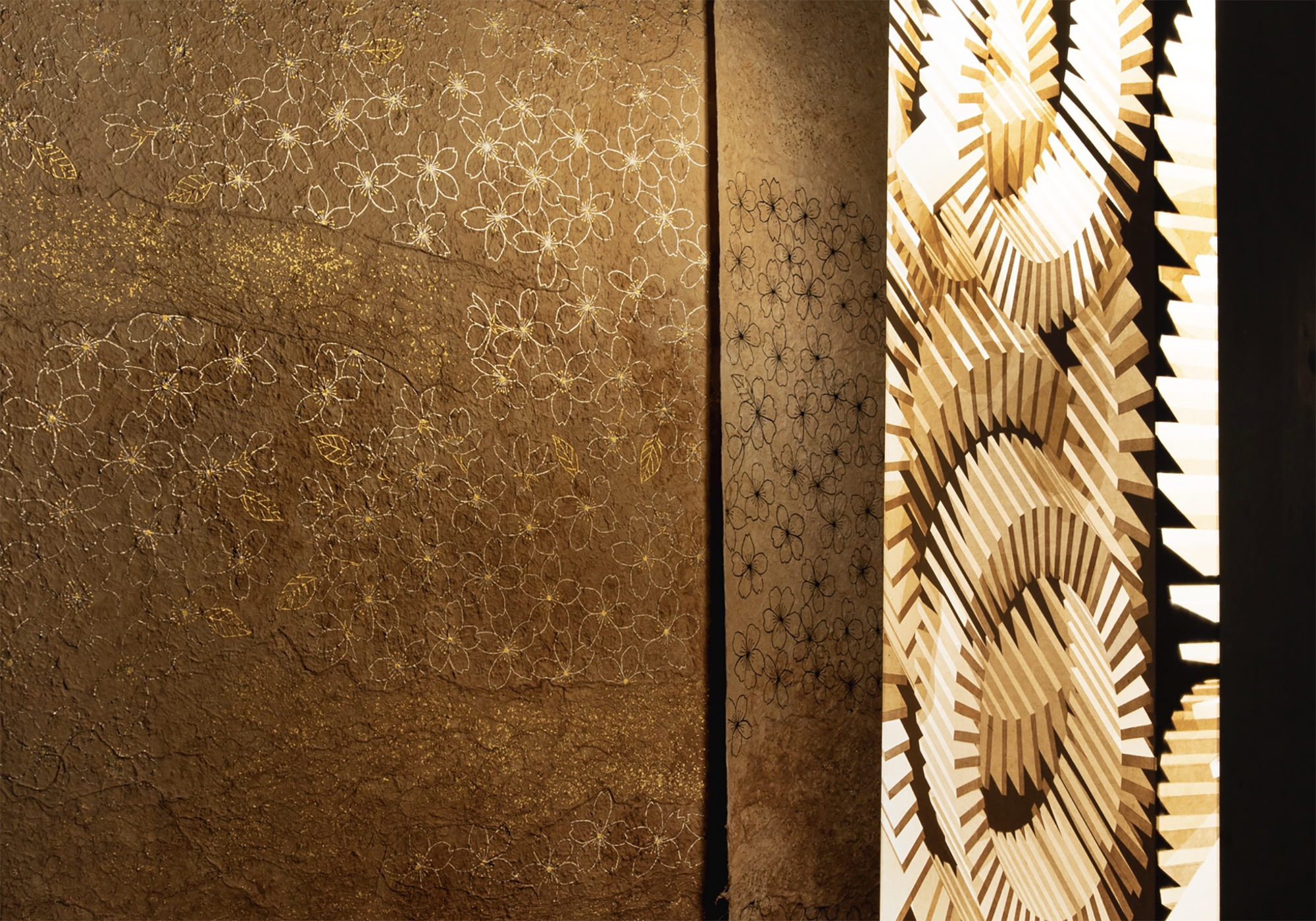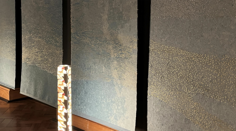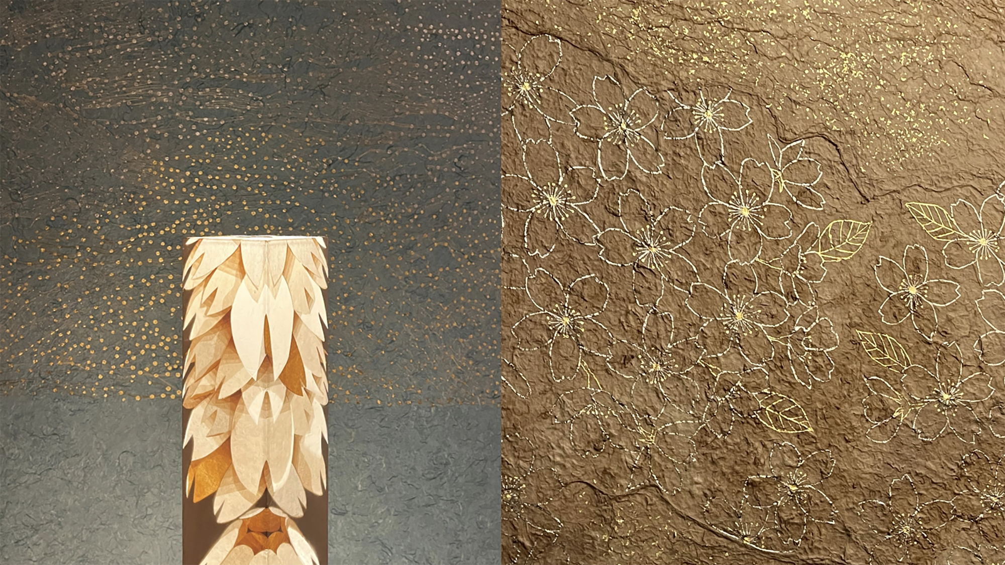 The “River” and “Cherry Blossom” tapestries are made from mulberry paper, dyed with indigo and cherry blossoms, made into paper, and pierced with kirikane.